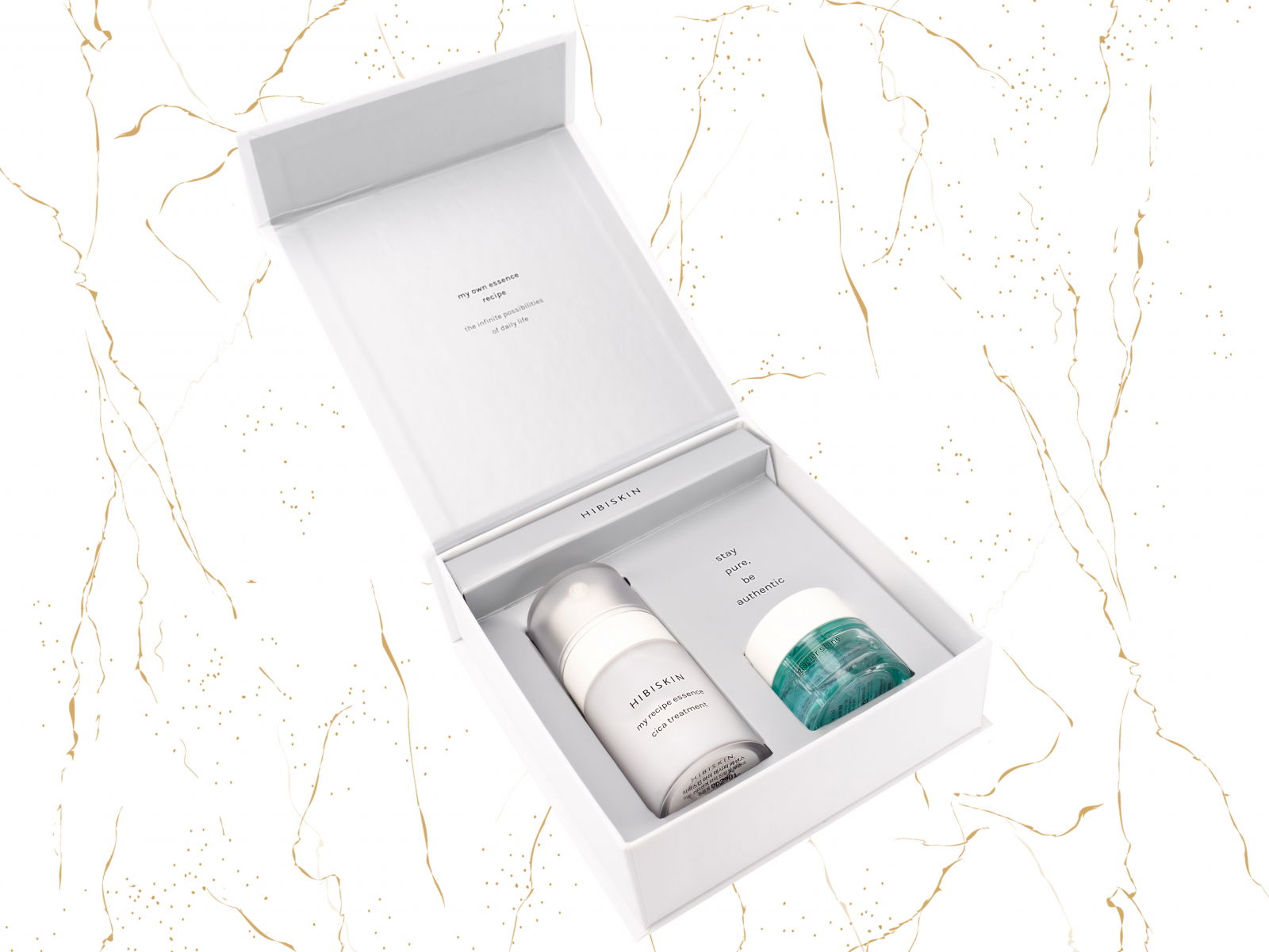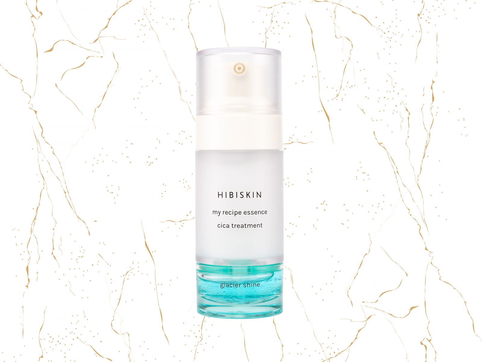 Mixul dintre esenta si ser Hibiskin My Recipe (Cica Treatment, Glacier Shine) este destinat tenului uscat si sensibil. Esenta are ca ingrediente de baza extract de Cica si de Centella asiatica care hidrateaza si calmeaza tenul, ajutand la mentinerea barierei naturale a pielii. Serul contine apa glaciara si 10 tipuri de acid hialuronic care ajuta la formarea unei pelicule ce mentine umiditatea in piele, iar complexul de amino acizi stimuleaza elasticitatea pielii.