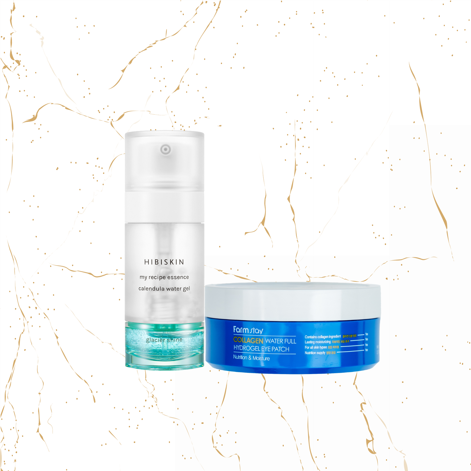 Mixul de esenta si ser Calendula Water Gel , Glacier Shine, calmeaza, revitalizeaza tenul si regleaza grasimea din pori. Mixul de esenta si ser Hibiskin My Recipe (Calendula Water Gel, Glacier Shin) hidrateaza tenul in profunzime si ii da stralucire.Patch-uri pentru ochi Farmstay Collagen Water Full Hydrogel, 90gPatch-urile cu colagen ajuta la imbunatatirea elasticitatii pielii din jurul ochilor. Plasturele cu hidrogel foarte concentrat cu colagen marin si extract de alge marine oferă hranire si hidratare zonei subtiri si uscate a ochilor.